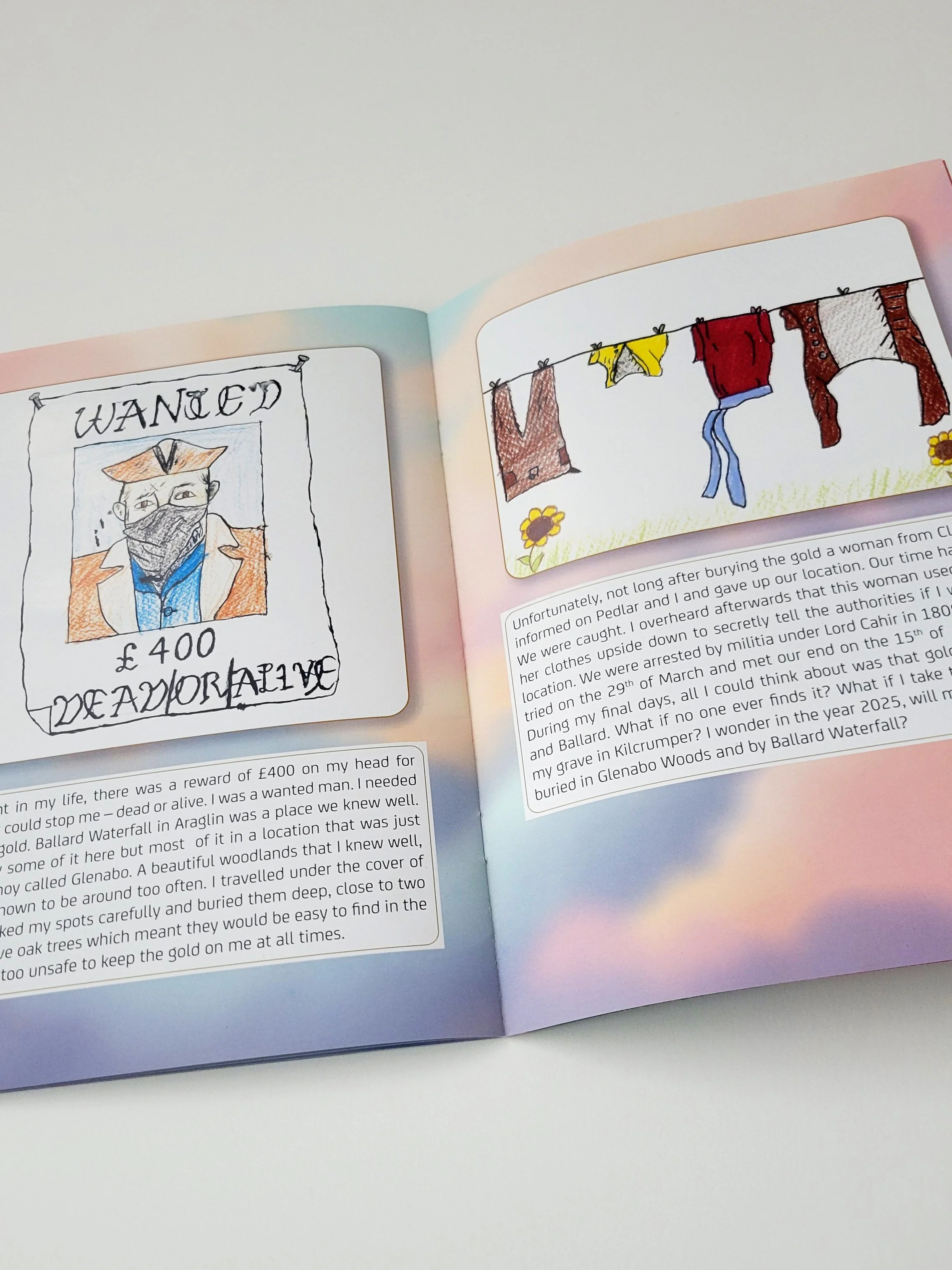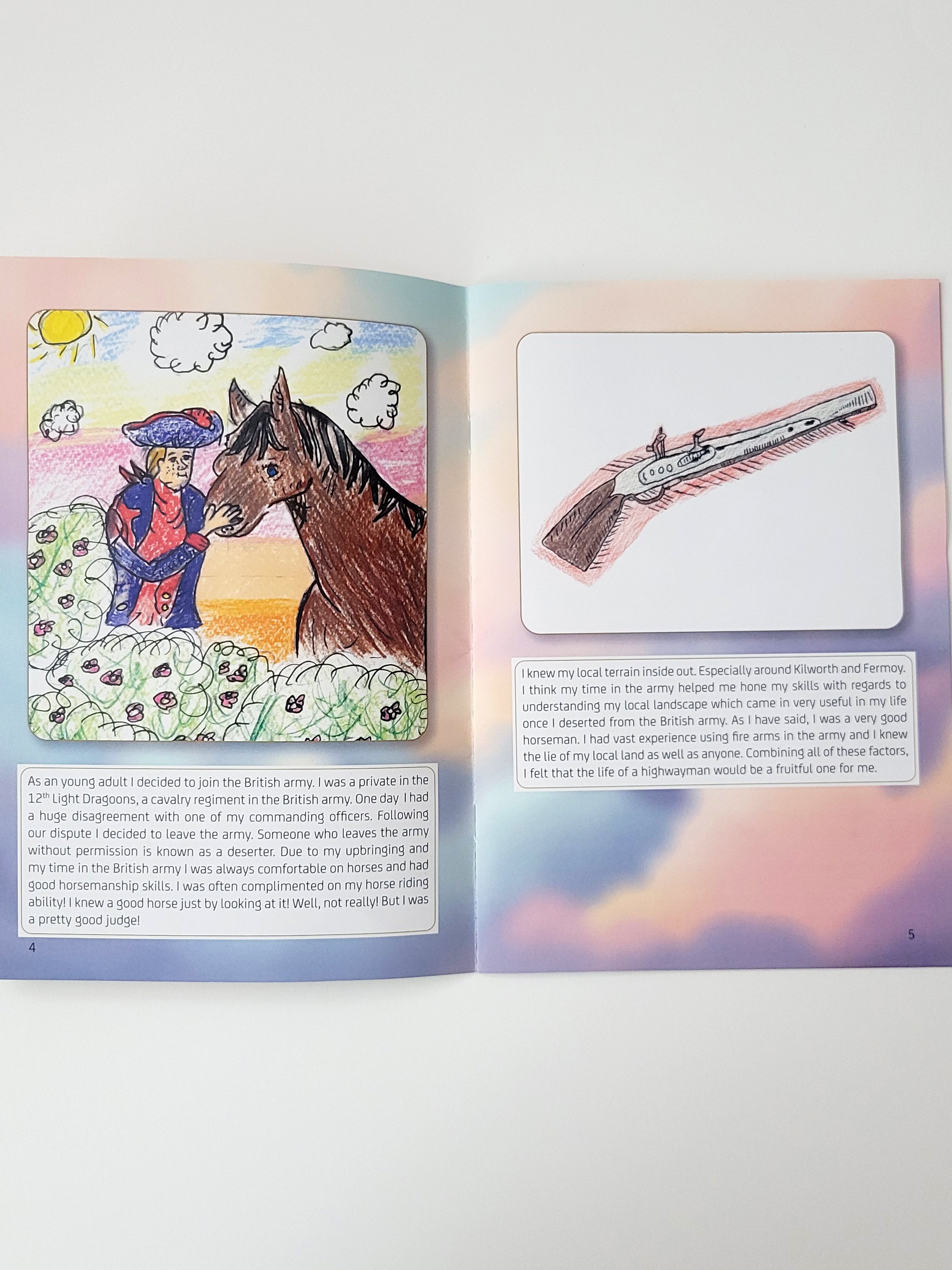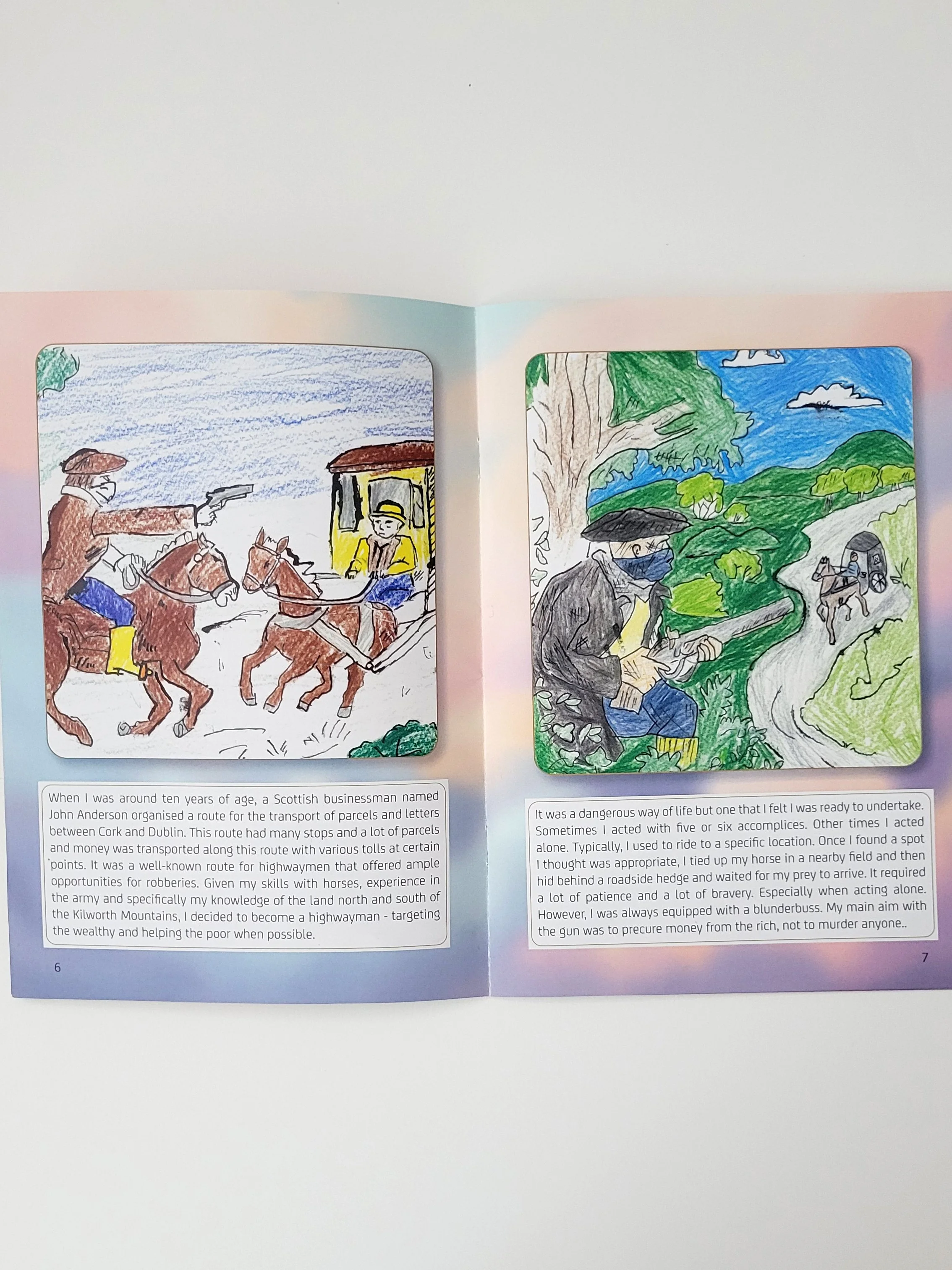 During this illustration workshop, the 5th and 6th class students explored and illustrated the life of Willie Brennan, the legendary 18th-century Irish highwayman who became a celebrated “Robin Hood” figure in Irish folklore. Working with a range of drawing media, they brought their texts vividly to life through their artwork.