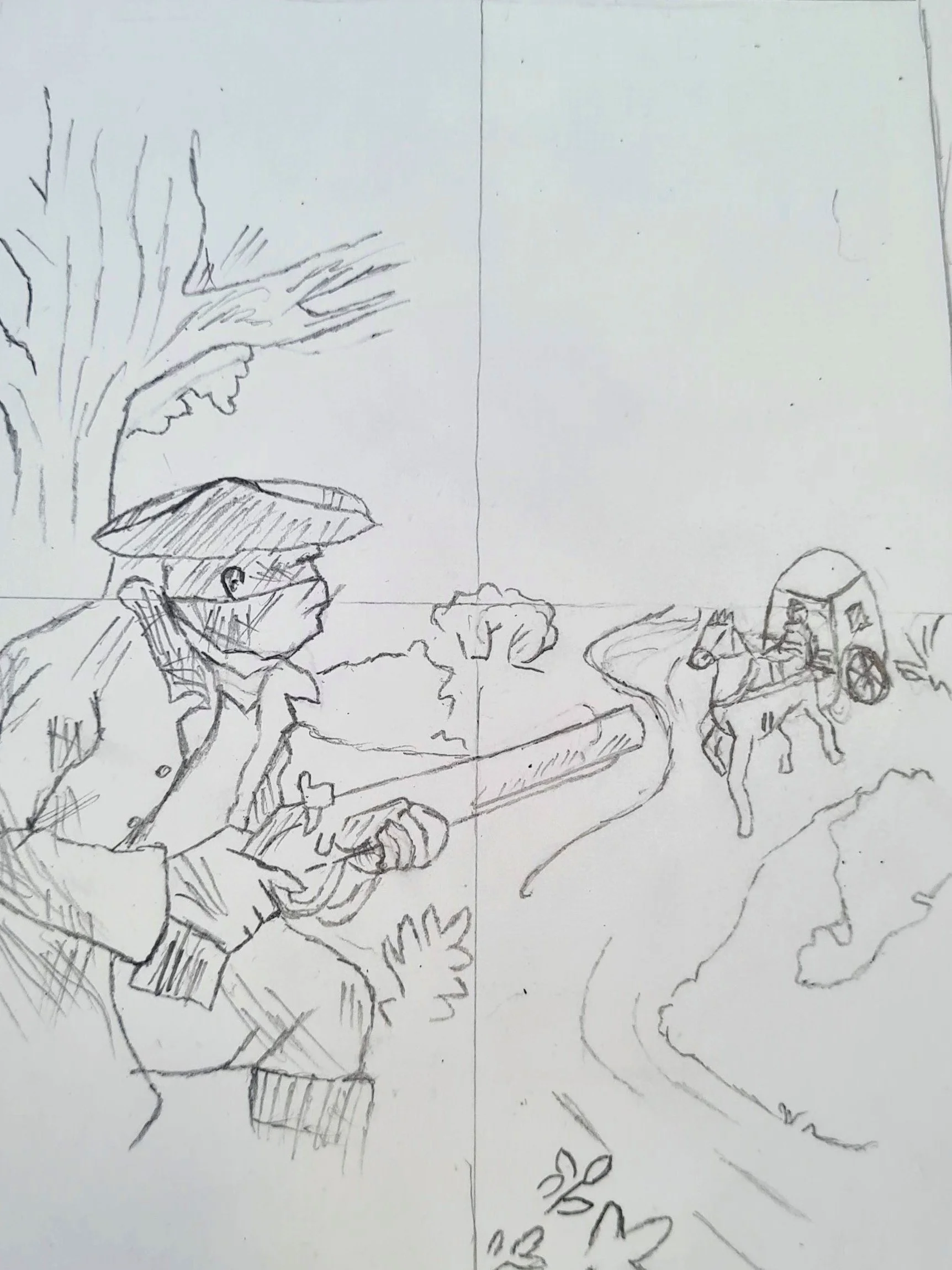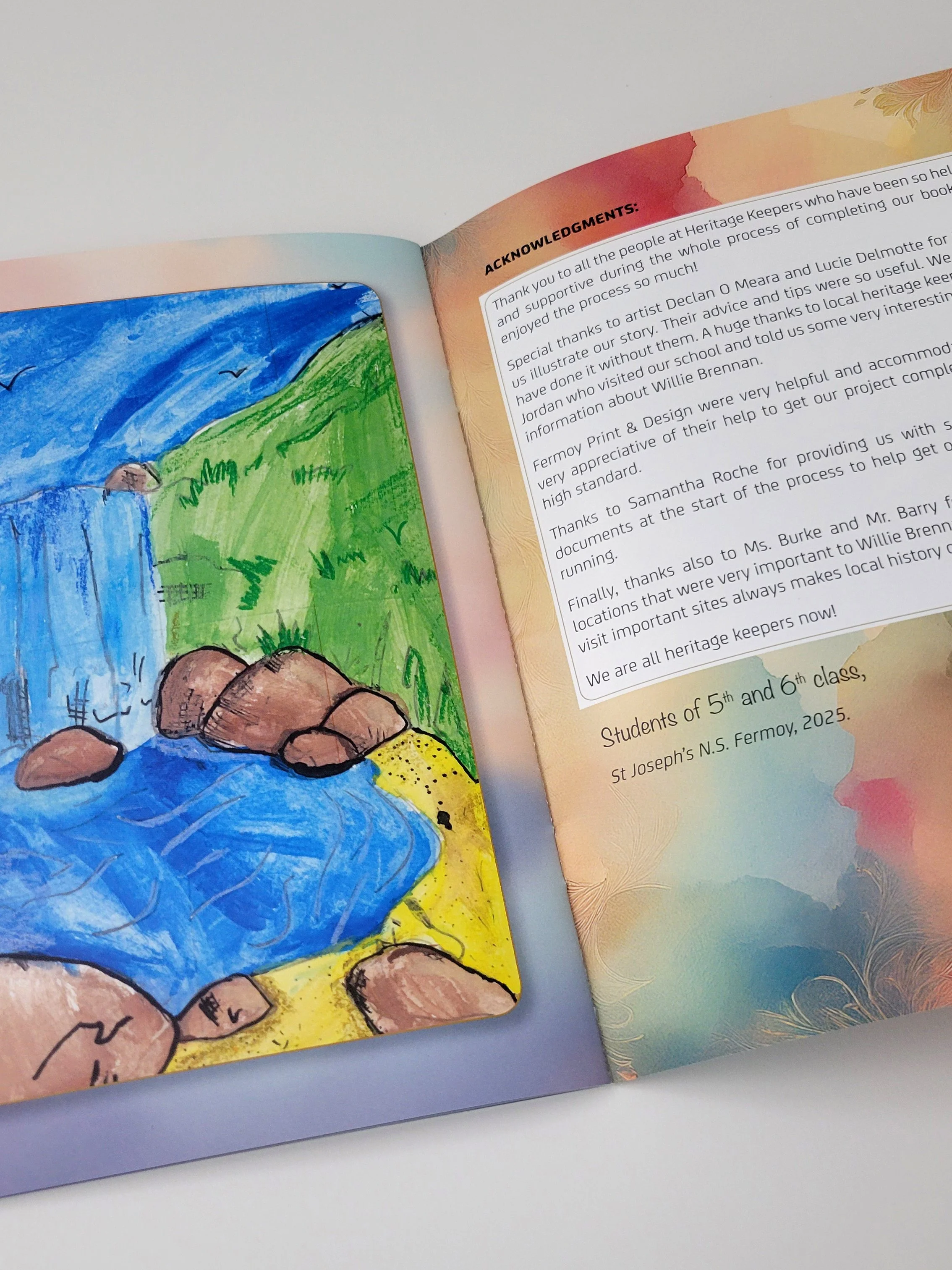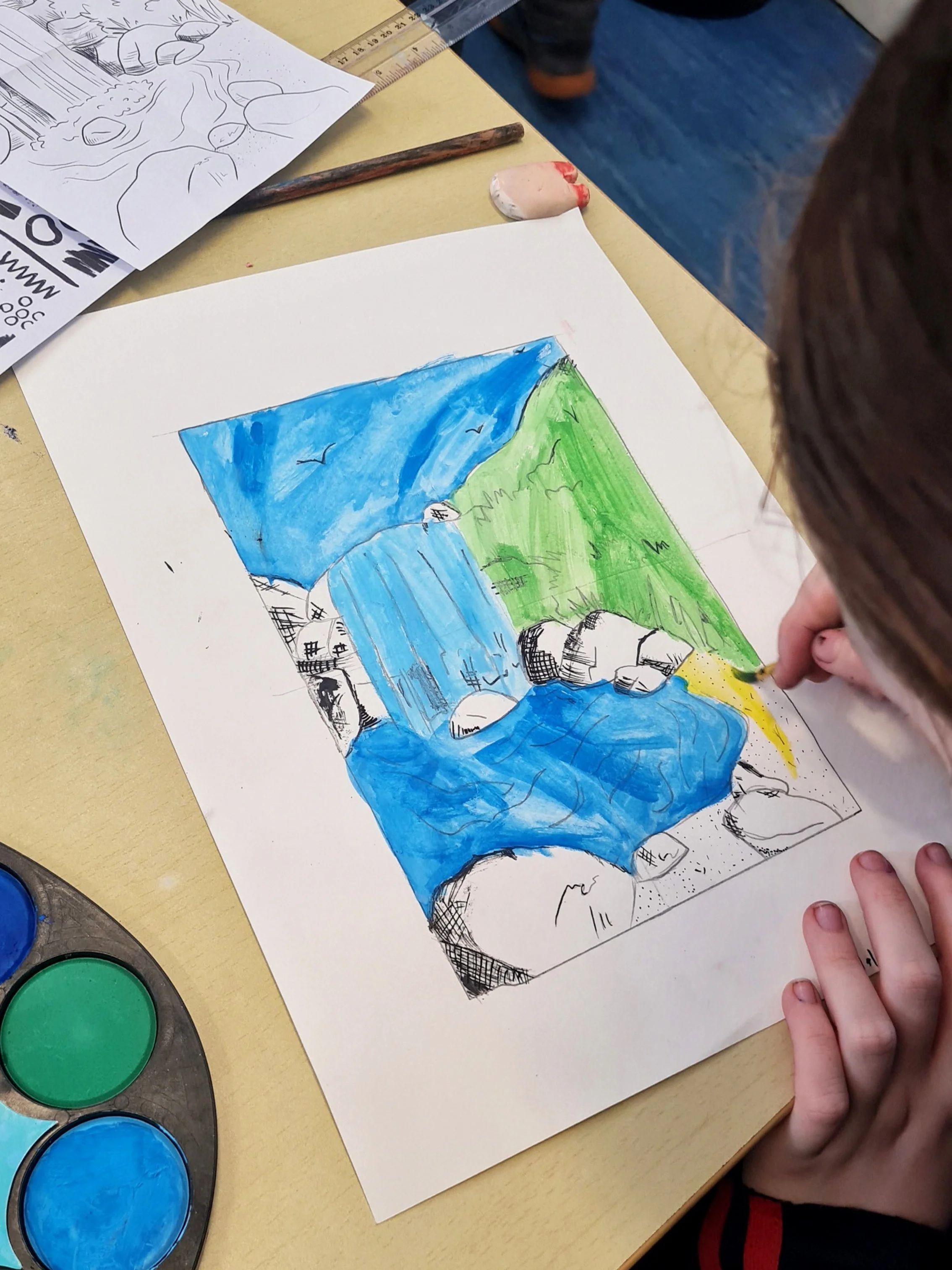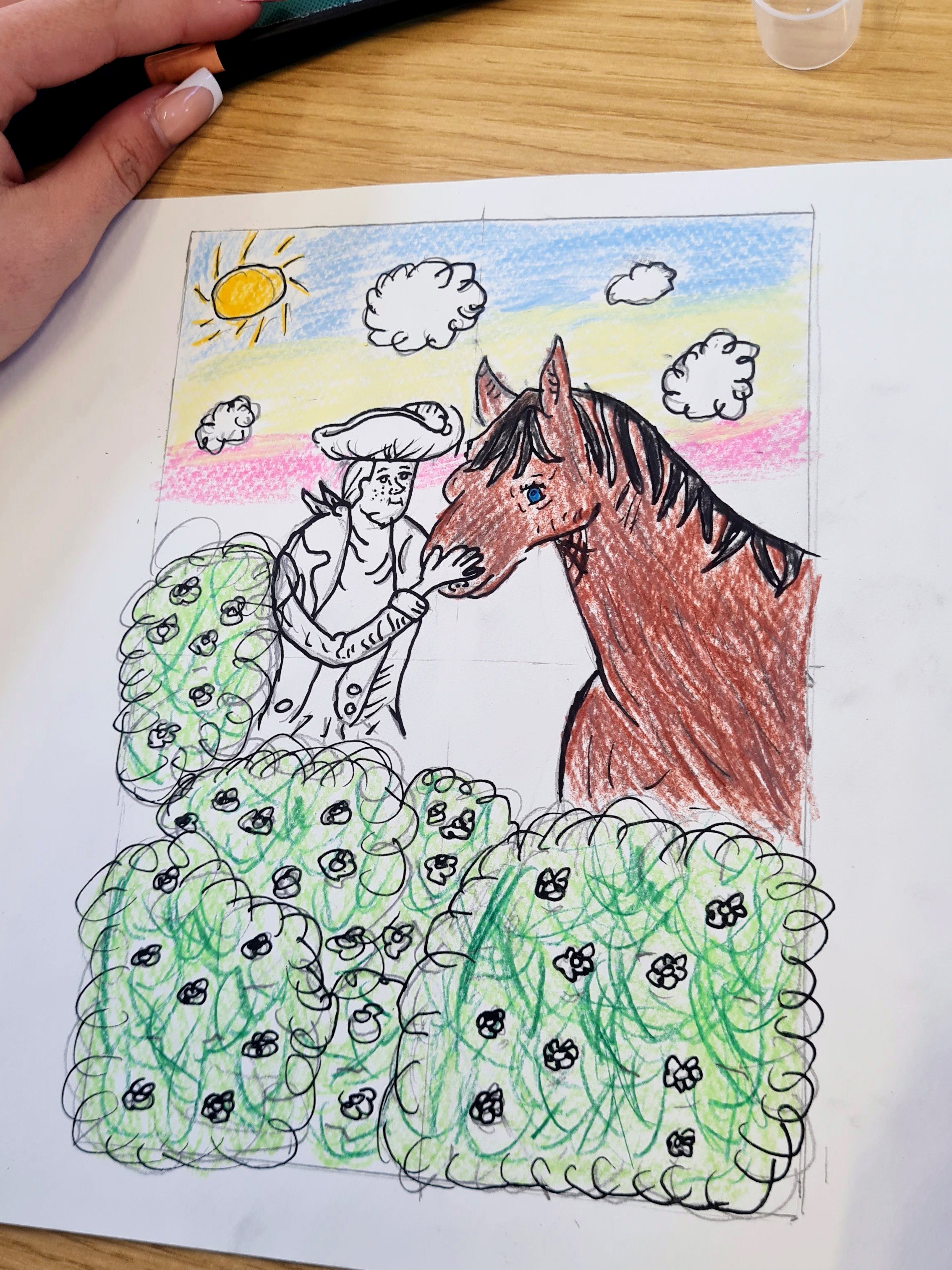 During this illustration workshop, the 5th and 6th class students explored and illustrated the life of Willie Brennan, the legendary 18th-century Irish highwayman who became a celebrated “Robin Hood” figure in Irish folklore. Working with a range of drawing media, they brought their texts vividly to life through their artwork.